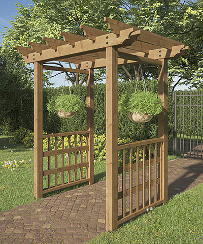 Note: This description refers only to the Vita Gardens Springwood Cedar Arbor, Brown, 91.875"H. The hanging baskets shown are not included.