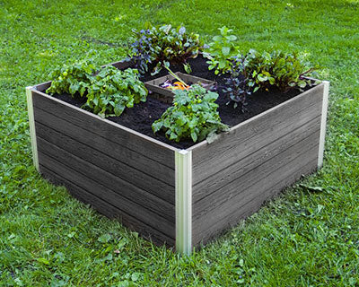Bring the timeless hobbies of gardening and composting into your modern yard using this Vita Gardens Slate Gray Urbana Composting Garden Bed. The square shape of this unit makes it simple to add to a corner of your landscaping, while its innovative materials provide longevity. Each reversible side panel is crafted from a unique blend of BPA and phthalate free polymers, for a food safe and sustainable piece. One side of each has a faux wood grain, creating a rustic hint, while the other sports a brushed finish to enhance the slate effect. Slide the edge of each panel into the included, aluminum upright supports to form the 4' frame. This provides plenty of deep planting area, and the grayish blue hue of the sides evokes stone. Interlocking panels create a basket, designed to sit in the center of the planter and hold organic material such as kitchen and yard scraps. Over time, these materials biodegrade, transforming into nutrient rich compost. Water through this basket once it is established to carry additional nutrients to plant roots, for a healthy garden. The open top makes it simple to reach toward the center and harvest your crops or add to the composting column, and the sliding channels on the uprights allow you to combine units together for a modular and customizable planter. The gray tones offset the lighter silver of the uprights, and the polymer body cleans using only a garden hose for easy maintenance. Dedicate a section of your yard to gardening and composting with this Slate Gray Urbana Composting Garden Bed. Assembly required. Ten year warranty.