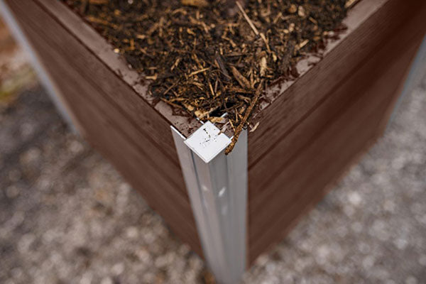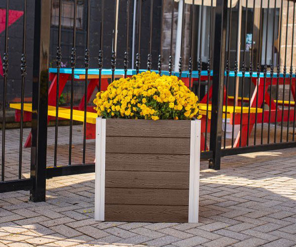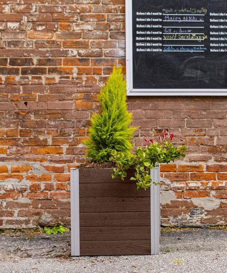 Add a geometric look to your patio or porch plant display using this Vita Gardens Espresso Urbana Cube Planter. Placing a planter within your garden or in your sunroom provides ample opportunity to showcase select plants, and the durable construction and classic colors of this item create a fantastic focal point. Brown slats, crafted from a polymer blend, sport a wood grain on one side and brushed finish on the other for a versatile display. The product is both phthalate and BPA free, making it safe for edible crops, and the vinyl construction is simple to maintain for many seasons. Its open interior holds a large potted plant easily, or can be lined with plastic to create a water tight seal. Aluminum channel posts complete the frame, and make assembly simple. Rest this planter on a level surface, allowing its straight design to contrast your flower. Bring lasting shape and style to your favorite potted plant by placing it in this Espresso Urbana Cube Planter. Assembly required. Ten year warranty.