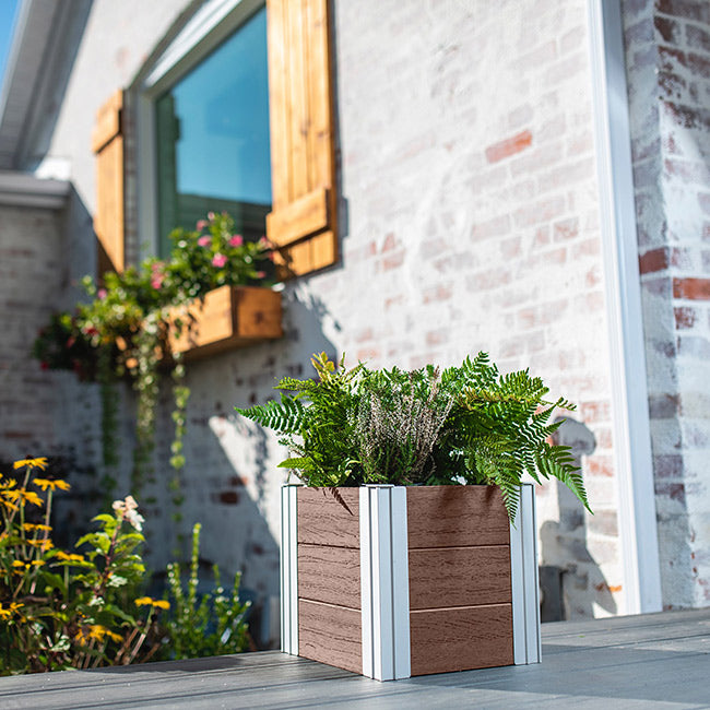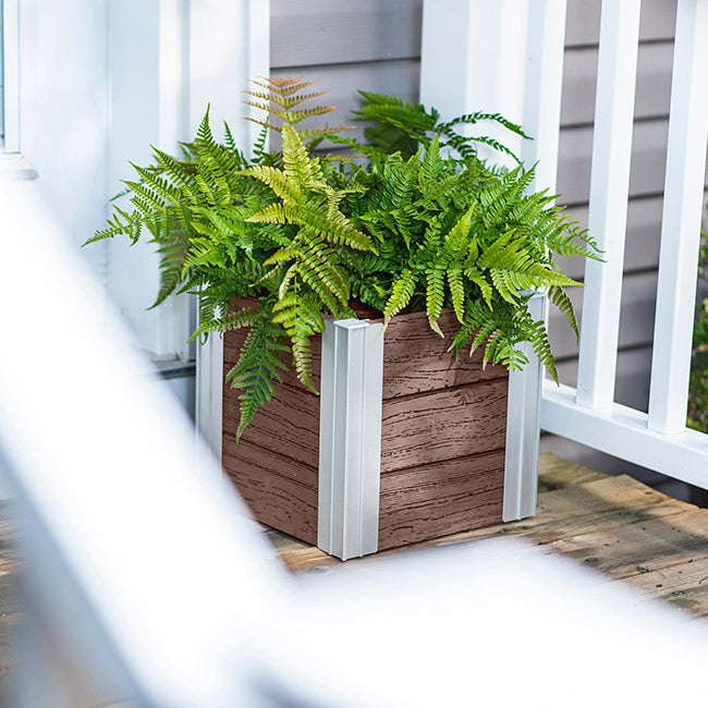 Frame a potted plant in a modern and glamorous way using this Vita Gardens Espresso Brown Urbana Cube Planter. The lasting, composite materials, deep brown and soft gray tones, and compact shape create this sleek planter, perfect for placing in your flowerbed, on a patio, or in a sunroom. A unique blend of BPA and phthalate free polymers forms the side and bottom panels, each sporting a faux wood grain within the brown finish for a natural hint. These panels easily slide into the included, anodized aluminum channel posts, creating the classic cube shape, and the gray tone on these corners contrasts the brown of the body for a bold effect. Add plastic or a coco liner (not included) to the interior of the unit for planting directly in it, or place a potted plant inside it for a convenient and beautiful display. Dual floor braces can be affixed to the side panels at the depth you desire for a versatile planter, and the slatted design of the floorboard allows drainage for healthy roots. The posts and level sides ensure versatility in placing the unit, and the vinyl body is equally suited to indoor or outdoor use. Bring sleek style to a favorite flower with this Espresso Brown Urbana Cube Planter. Assembly required. Ten year warranty.