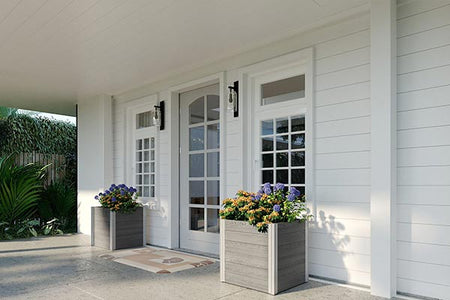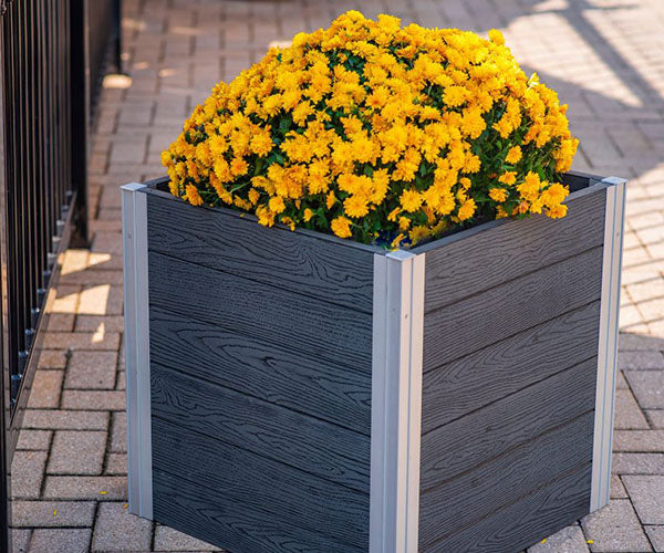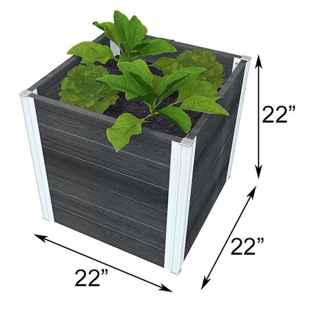 Add a geometric look to your patio or porch plant display using this Vita Gardens Slate Gray Urbana Cube Planter. Placing a planter within your garden or in your sunroom provides ample opportunity to showcase select plants, and the durable construction and classic colors of this item create a fantastic focal point. Gray slats, crafted from a polymer blend, sport a wood grain on one side and brushed finish on the other for a versatile display. The product is both phthalate and BPA free, making it safe for edible crops, and the vinyl construction is simple to maintain for many seasons. Its open interior holds a large potted plant easily, or can be lined with plastic to create a water tight seal. Aluminum channel posts complete the frame, and make assembly simple. Rest this planter on a level surface, allowing its straight design to contrast your flower. Bring lasting shape and style to your favorite potted plant by placing it in this Slate Gray Urbana Cube Planter. Assembly required. Ten year warranty.