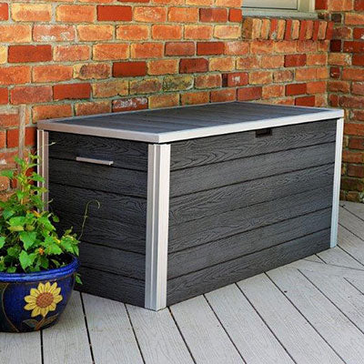 Provide beautiful and generous storage to your yard or pool deck with this Vita Gardens Slate Gray Urbana Deck Storage Box. A wealth of gray colored boards and aluminum channel posts form this significant, rectangular unit, which brings classic style to your area in moments. Each of the phthalate and BPA free, polymer blend boards sports a faux wood grain finish for a natural hint, and they slide easily into the included, aluminum channel posts. A sturdy base and lid complete the box, whose open center easily holds your pool equipment, outdoor cushions, or garden supplies. Hinges make it simple to open or close the piece, and two actuated arms keep the lid open for easier reach. Weather stripping inside the box helps keep the contents dry, and the lid has an audible click to ensure a secure closure. The unique construction provides the look of wood with the sturdiness and versatility of vinyl, and the gray tone blends with a wealth of motifs. Rest the generous, level base of this unit on concrete, wood, or grass, for a fantastic storage spot. Conveniently contain your small to medium outdoor decorations or garden tools using this Slate Gray Urbana Deck Storage Box. Assembly required. One year warranty.