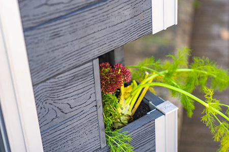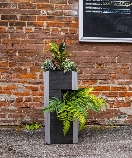 Contrast bold, straight lines with the rounded leaves of your favorite plants using this Vita Gardens Slate Gray Urbana Pillar Planter. This significant, dual level planter is certain to capture attention, turning potted plants into a bit of abstract, living art. Striking gray, polymer blend slats create this frame, and one side of each sports a faux wood grain for a bit of texture. The opposite side has a brushed finish for a sleek effect, and the phthalate and BPA free vinyl material is easy to maintain while being safe for edible plants. Aluminum channel posts hold these slats in place, and a cutout section near the center accents the planter's height. This doubles the display area, fantastically showcasing vines or another trailing plant. Line the unit with plastic or rubber (not included) to create a water tight design, or use potted plants on both levels to keep soil tidy and in place. The frame sits on a level surface with ease, and the gray hues nicely evoke slate. Increase the planting options and visual interest on your patio or in your lawn with this Slate Gray Urbana Pillar Planter. Assembly required. Ten year warranty.