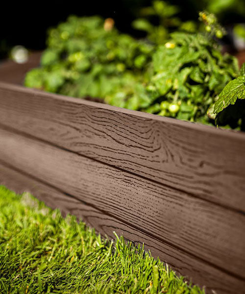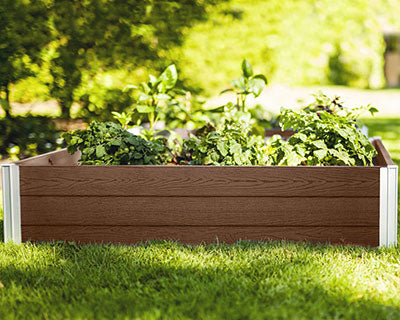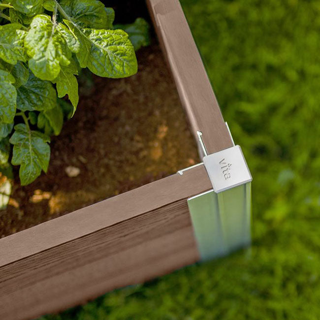 Give your plants ample room to grow in this sleek, Vita Gardens Espresso Urbana Raised Garden Bed. This stylish, square planter is made from an innovative new material, meticulously designed for durability and ease of use. Crafted from high grade polymers free of BPAs and phthalates, the slats offer the look of wood with the durability of vinyl, and are safe for food cultivation. Each 4' long panel slides into the included, aluminum upright supports without any tools, and forms a generous planting area, with plenty of space to plant rows of herbs, crops, or flowers. The 11" height makes it easy to reach the center and maintain your garden, and the charming, espresso-colored frame enhances your yard. One side of each panel sports a faux wood grain, while the opposite side has a brushed finish for versatility. The gray tone of the aluminum, upright supports provides contrast, and several units can be combined in a wealth of configurations for a truly customizable garden. Transform a section of your yard into a versatile and lasting garden plot using this Espresso Urbana Raised Garden Bed. Assembly required. Ten year warranty.