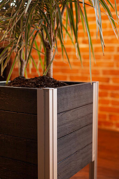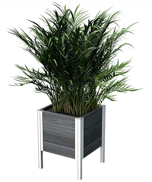 Turn a flower or shrub into a true deck centerpiece by placing it in this Vita Gardens Slate Gray Urbana Raised Planter. The varied gray tones, square body, and lasting materials make this planter a wonderful, artistic addition to your patio or deck, almost as beautiful as the plants it holds. A hardy blend of BPA and phthalate free, food safe polymers forms the sides and base of this unit, while aluminum posts complete the frame. A slate gray hue on these panels adds a traditional hint, and one side of them has a wood grain finish. Flip them to display the brushed finish for a more contemporary effect. The tall posts rest on a level surface with ease, and the planter makes a statement when grouped with others from the same line. Add a liner to the item to keep it water tight, or install a 16" diameter or smaller pot inside it for a convenient plant display. The tall legs of the item ensure air circulates all around your plant, while keeping the unit visible, and the lasting polymer construction is simple to clean and maintain. Add a shrub or plant to your patio with elegance and versatile style using this Slate Gray Urbana Raised Planter. Assembly required. Ten year warranty.