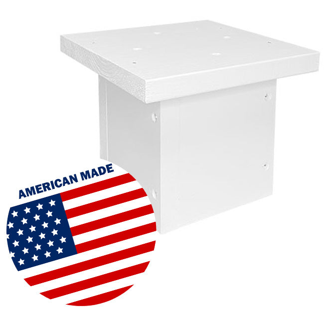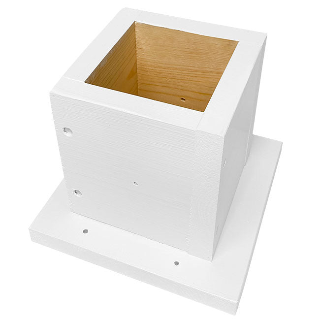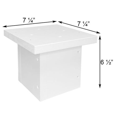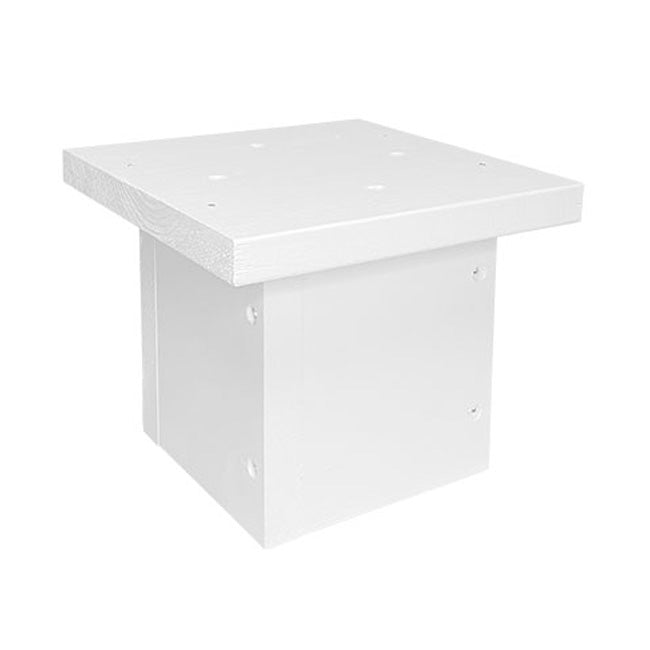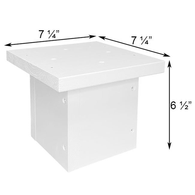 Affix an existing, white bird house or feeder to a post in style with this White 4 x 4 Post Mounting Bracket by Prime Retreat. The significant, flat top, extended bottom collar, and all pine construction of this unit make it simple to attach to larger bird houses or feeders, while its white, painted finish blends with many existing homes. Its 5.5" long sleeve slides directly atop a traditional, wooden 4 x 4 post in moments, and dual, predrilled holes here allow you to screw this adapter into the post for extra anchoring. The generous, 7.25" square, top platform wonderfully holds larger bird houses or post mounted feeders, and its four predrilled holes make it easy to connect the two together. Made of hardy pine and painted crisp white, this bracket will look great and remain sturdy for many seasons of use. Showcase your white birding accent on an existing 4 x 4 with help from this White 4 x 4 Post Mounting Bracket. Made in the USA.