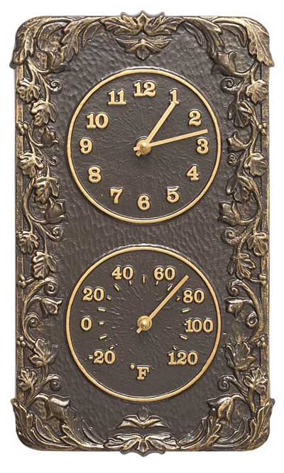 Add a natural feel to your weather monitoring with the Whitehall Acanthus Clock and Thermometer. Decorative acanthus vines wind their way around the perimeter of the clock and thermometer for interest. A hammered finish gives depth to the instrument, while a lighter gold colored finish on the numerals and indicators helps them stand out. The large numbers on the clock and thermometer make readings easily visible from across a room or patio area, and the dark bronze finish adds an elegant feel. With a wide temperature range of -20° to 120° Fahrenheit, the thermometer will surely offer you an accurate reading any time of year. The rust-proof recycled aluminum casting and durable, weather-resistant finish ensure that this accent will complement your home or yard for years. The unit uses one included AA battery for power, and may be hung using the included mounting hook. Display the time and temperature in a lovely way with this Acanthus Clock and Thermometer. Made in the USA.