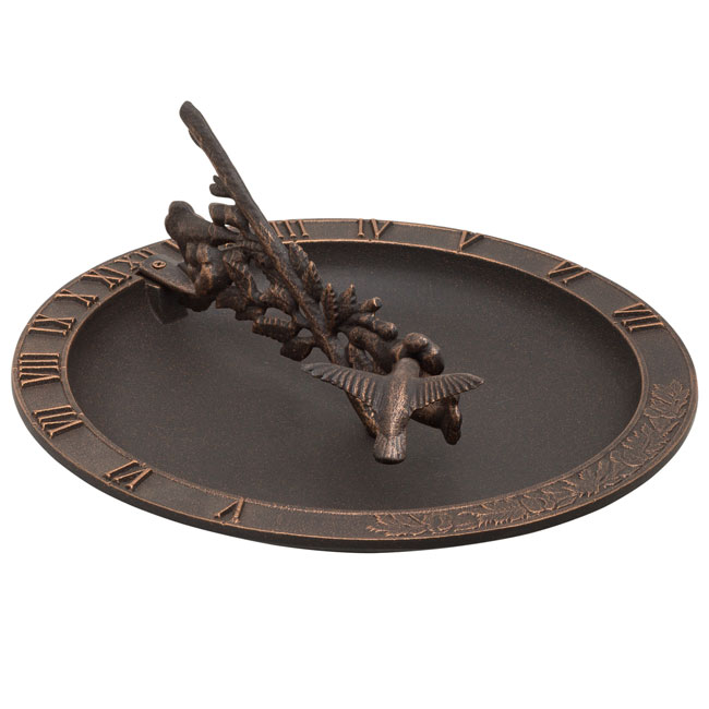 - Copper toned hints on the bird, flowers, and numerals gleam in the sun, contrasting the darker bronze colored base