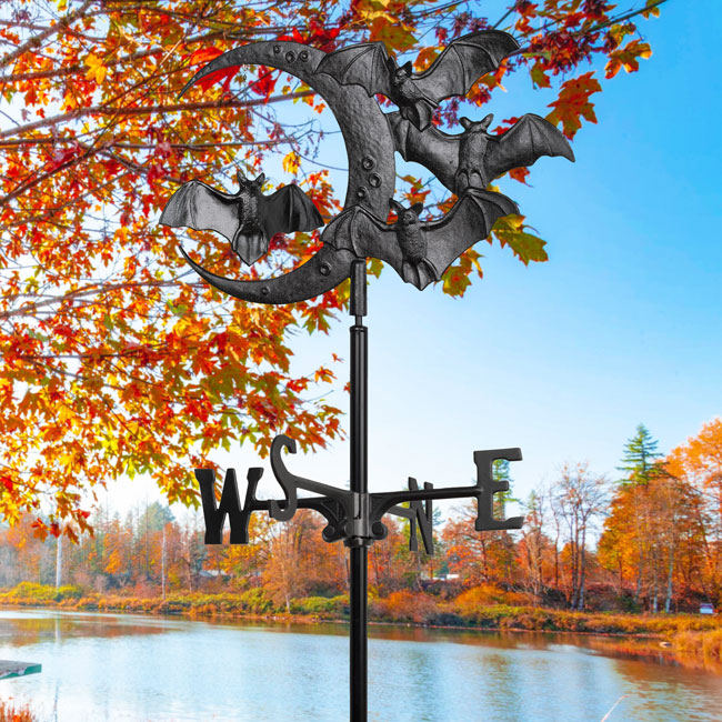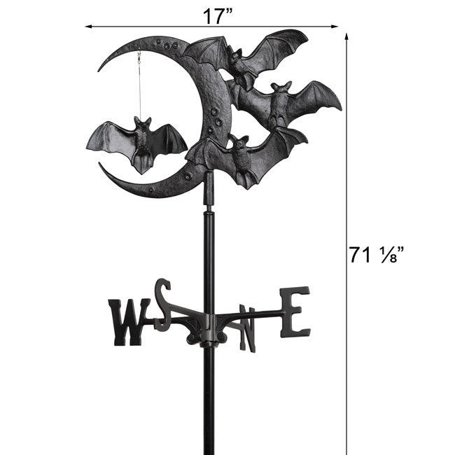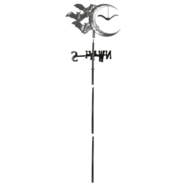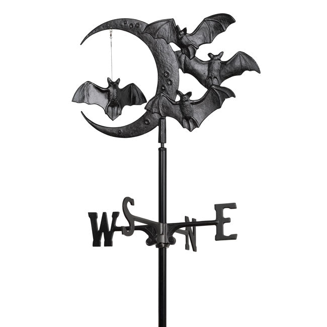 Celebrate bats in a fun way every season using the Whitehall Bat and Moon Garden Weathervane. This adornment will certainly add a touch of Halloween to your landscaping or garden all year. The intricate topper lends style and excitement to this item. A crescent moon shape forms the center of the topper, with three bat figures along its exterior to capture attention. A fourth bat figure is suspended from the top of the moon, for extra movement and excitement on the piece. The topper sits on a 5' tall, aluminum mast, and arms which hold directional indicators affix to this shaft. The topper swivels in the wind, for you to note any changes in direction easily. Made from lasting aluminum, this vane will remain viable and lovely for several seasons, and the base installs in the soil in moments. Its all-black finish further enhances the theme, meshing with any garden. Add an enchanting hint to your landscaping with this Bat and Moon Garden Weathervane. Assembly required.