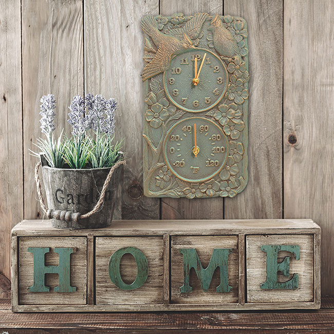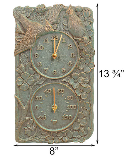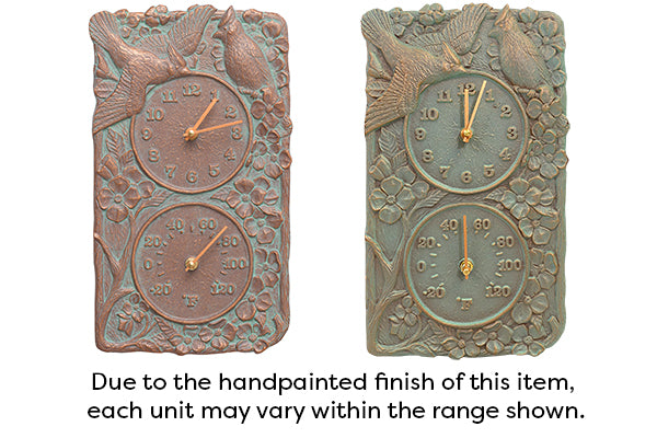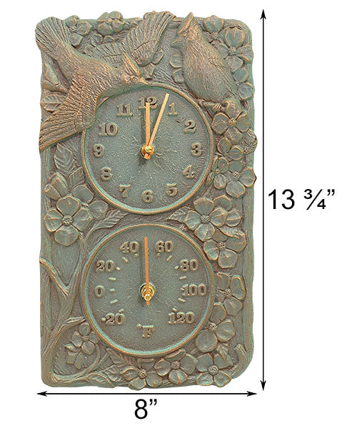 Add avian antics to your outdoor wall using the Whitehall Cardinal Clock and Thermometer. Three-dimensional cardinal, flower, and branch shapes form the detailed frame on this piece, lending a natural look to your patio or deck. One of the cardinals appears in flight, while the other seems to rest within the branches. Two circles occupy the center of this rectangular unit, the top one an analog clock and the bottom one creating a thermometer. The clock runs on a single, AA battery (included), and the -20° to 120° Fahrenheit temperature range allows the thermometer to measure both cold winters and hot summers. Crafted from durable aluminum, the item will easily withstand use outdoors for a fantastic garden addition. Its verdigris background tone enhances the nature scene on it, while copper colored hues within many of the depressions and crevices add contrast. Attach this unit to your wall with its included mounting hook, so you can obtain both the time and temperature at a glance. Enjoy cardinals in your living space while monitoring the weather and time with this Cardinal Clock and Thermometer. Made in the USA.