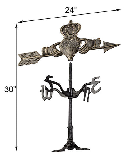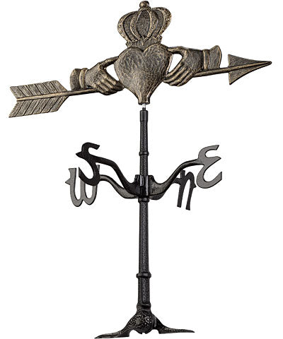 Adorn your shed or garage with a lasting symbol of loyalty using this Whitehall Claddagh Rooftop Weathervane. Placing this piece on your roof ridge beautifies the area in moments, and showcases your love of Irish traditions. A classic claddagh, two hands supporting a crowned heart, forms the striking topper, perfectly centered on a 24" long arrow. A generous, aluminum mast supports this arrow, and the ornament's gold hints above the black finish add an elegant effect. Arms beneath this topper hold the four cardinal directionals, and the arrow swivels in a breeze to showcase from where the wind originated. The unique base sports a flexible, center joint, allowing this unit to be installed onto a variety of differently pitched roofs. Crafted from aluminum, this instrument will withstand use for many seasons, and its black and gold hues further the classic motif. Showcase your Irish heritage on your roof with this Claddagh Rooftop Weathervane. Assembly required.