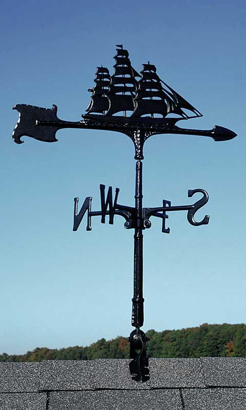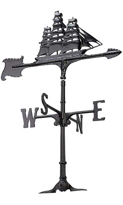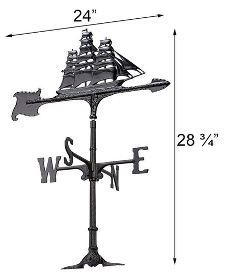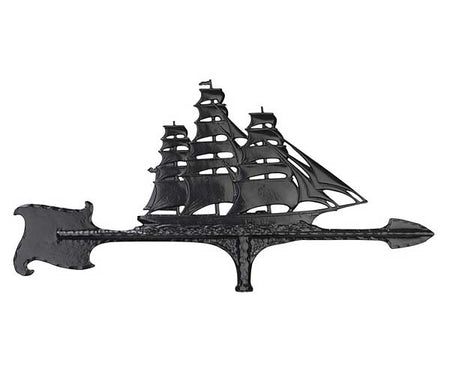 Showcase your love of all things antique using the Whitehall Clipper Large Accent Weathervane. This remarkable adornment celebrates the wind in two ways. The intricate topper mimics a clipper ship of the nineteenth century, with its three masts and multitude of sails. These ships were prized for speed, assisted by wind and the sails, and this one will always face the wind. It rests on a 24" long arrow, with its bow facing the front of the arrow. When moved by the wind, the arrow will face the originating direction, making the vessel appear as if it keeps the wind in its sails. The arrow is supported by a 19.5" long mast, for height and visibility on the piece. Four arms with directional indicators also sit on the mast, and these can be placed to properly indicate your direction. Crafted from resilient aluminum, this vane will last for several years while withstanding the elements, and its black color remains lovely. An innovative, hinged base attaches to any angle of roof equally easily, for you to place this unit on your home or barn. Bring a dramatic vessel to your inland retreat using this Clipper Large Accent Weathervane. Assembly required.
