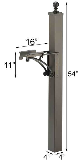 Add a stylish base to your existing Whitehall French Bronze Deluxe Mailbox with the Whitehall French Bronze Deluxe Mailbox Post and Brackets. This attractive, metal base is made to specifically hold the Whitehall French Bronze Deluxe Mailbox (not included), for an elegant look on your curb. Made from durable, recycled aluminum and coated with a weather resistant finish, this bronze colored post will never rust and certainly will remain lovely. The round finial adds a classic look, while the two included scrollwork brackets bring extra support to the item. Easily place your existing mailbox onto the post with the included hardware mounting kit, and slide the hollow metal post over a 4 x 4 post (not included) for stability. Enhance your curb with this French Bronze Deluxe Mailbox Post and Brackets.
