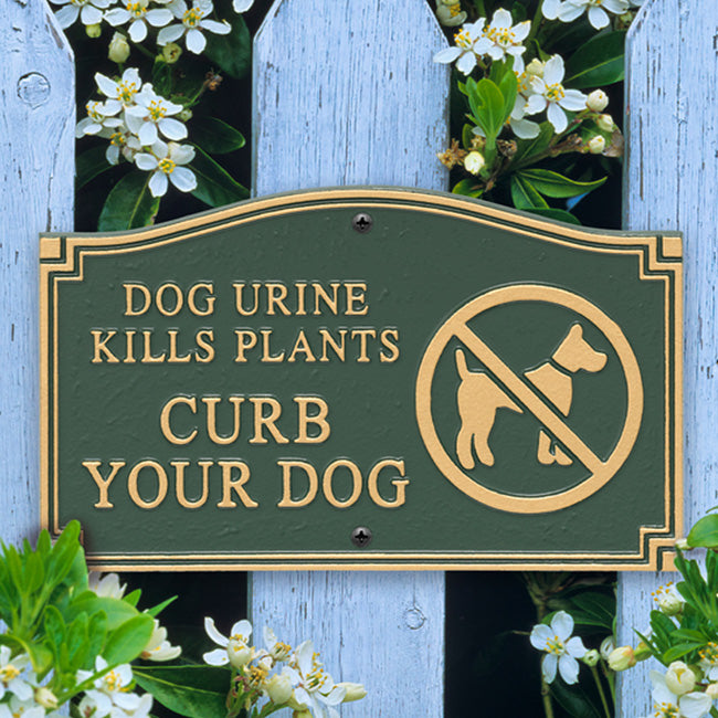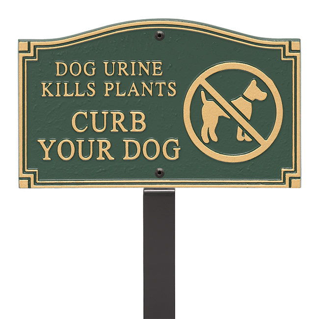 Fend off unwanted damage to your plants in an attractive and effective way with this fantastic Whitehall Green and Gold Dog Urine Kills Plants Plaque. Nitrogen in canine urine can dry out plants, causing them damage, and this arresting green statement plaque is a spectacular way to set up a friendly reminder. The piece’s gradual arch is accented by a raised, dual gold border for a visually appealing accent as it surrounds centering lettering that says “Dog Urine Kills Plants”. Below this rests another set of gold text reading “Curb Your Dog” to clarify the sign’s intended effect. Next to this attractive and eye-catching text is a figure of a dog with a prohibited sign over it, further illustrating the meaning. The substantial outer line lends a bright flair to this durable unit, while the fine interior border adds further panache. This robust, aluminum plaque is rust and weather resistant to ensure long term allure throughout many seasons of service. An included, 18” lawn stake makes yard placement an easy task, or use the included attachment hardware to display this item on your deck or fence. Kindly remind neighborhood dog walkers to be mindful of their pets around your favorite flowers with this Green and Gold Dog Urine Kills Plants Plaque. Hand cast from recycled aluminum in the USA. Five year warranty.