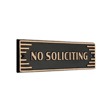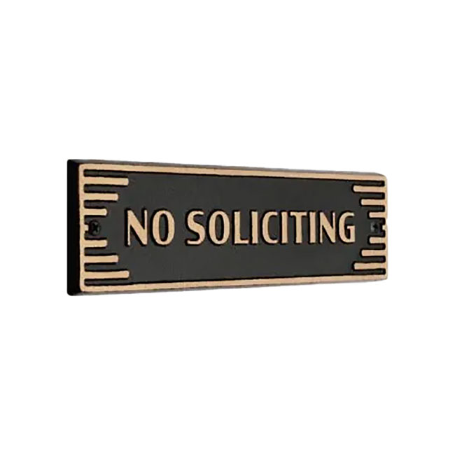 Add a bold addition to your door or keep unwanted visitors away from your doorstep with this bold and elegant Whitehall No Soliciting Door Art Deco Plaque.