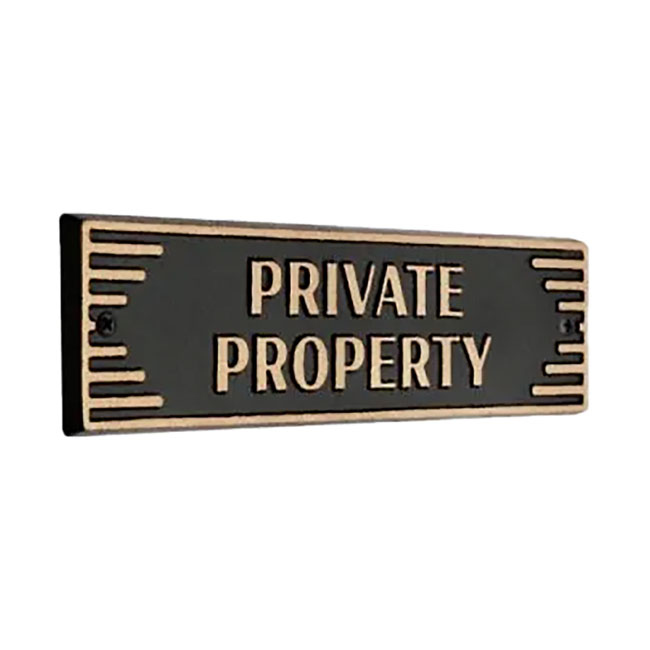 - Neatly displayed "Private Property" message keeps unwanted visitors off your grounds