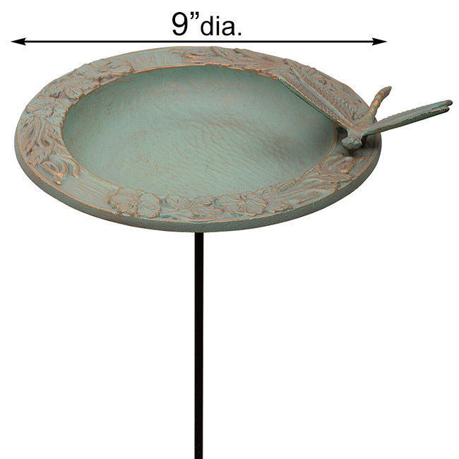 Blend a marshland hint with your birding hobby using the Whitehall Dragonfly Garden Bird Feeder. This exciting and versatile feeder creates a classic look in your yard with ease. The 1" wide lip around the unit has flower and leaf shapes in relief, for texture on the item, while a three-dimensional dragonfly figure rests on the side of the piece. This lip creates perching area around the 7" diameter basin, which holds up to 0.85 quarts of seed. Use safflower, sunflower, or mixed seed to feed a variety of birds, or use fruit and mealworms for a more select feeding station. This dish attaches to the included 17" long stake, installing into your soil with ease. Remove the feeder from the stake for cleaning and refilling it. Its copper color enhances your home or landscaping, and the verdigris colors on the recessed portions add contrast. Made of aluminum, the feeder is designed to last for several seasons. Create a fun theme in your yard with this Dragonfly Garden Bird Feeder. Made in the USA.