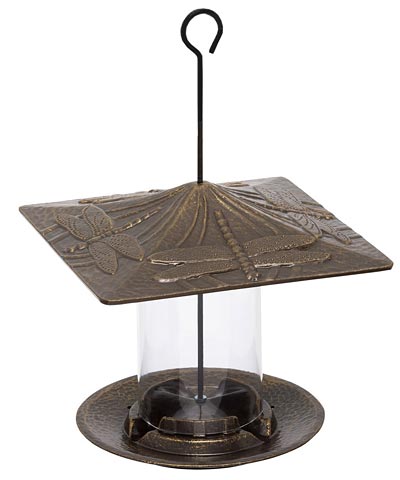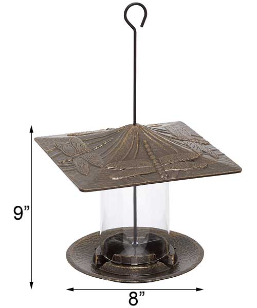Watch the birds in your backyard buzz around the Whitehall Dragonfly Tube Bird Feeder. Three dimensional dragonflies decorate the square roof, which protects the seed from the elements. The clear plastic seed tube holds one and a quarter quarts of seed, and offers easy monitoring of seed levels. The three small seed ports at the base of the tube allow birds to have easy access to seed, and the round 8" diameter base acts as a perch for your feathered friends. Simply slide the roof up the included black powder coated hanger for easy cleaning and filling. The recycled aluminum roof and tray are weather resistant and will provide enjoyment for many years. Made in the USA.