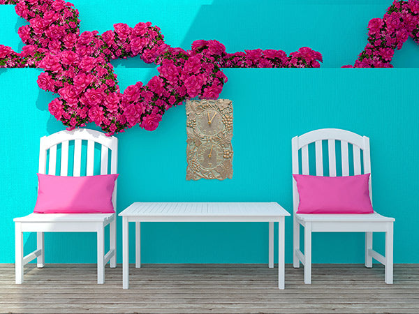 Use your love of wine and vines as exciting home décor with this Whitehall Grapevine Clock and Thermometer. This rectangular unit not only displays the time and temperature; its raised grape cluster, leaf, and vine figures specifically celebrate this plant. An analog clock sits at the top of the piece, its soft copper tone adding a classic look. Verdigris hints beneath the raised numerals provide visibility, and copper colored hands complete the timepiece. Additional, lifted numerals, lines, and a needle on the bottom dial form a working thermometer, displaying the temperature between -40° and 120° Fahrenheit. Use the included AA battery to power the clock, and display this unit on your wall with its attached hanger. The aluminum construction creates a durable and lasting instrument, complementing either your home or your yard equally well. Add a vineyard motif to any setting in moments with this Grapevine Clock and Thermometer. Made in the USA.