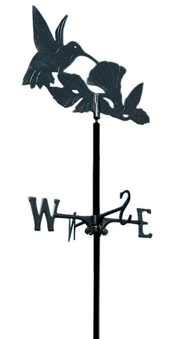 Celebrate hummingbirds all year using the Whitehall Hummingbird Garden Weathervane. This dramatic vane adds both function and form to your garden, for an artistic look. A metal hummingbird shape, hovering over a flower and dining on it, creates the exciting topper. This sculpture sits on the included, 5' tall mast, for height and visibility in your yard. Directional markers on four arms also attach to the mast, and can be properly oriented for accuracy. The hummingbird and flower topper swivels in a breeze, and the black color of the parts lends a classic look to the piece. The rust-free, all aluminum construction allows you to enjoy this vane for years to come, and it installs into your garden soil in moments. Keep a hummingbird shape in your yard each season using this Hummingbird Garden Weathervane. Assembly required.