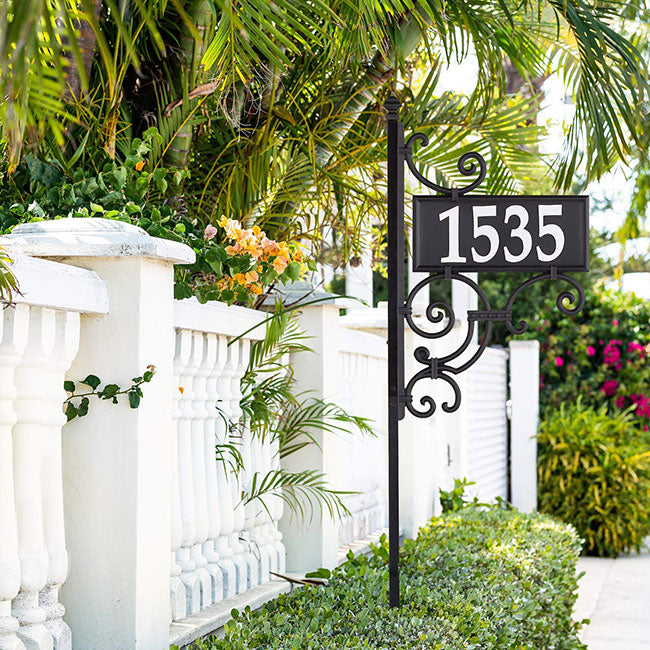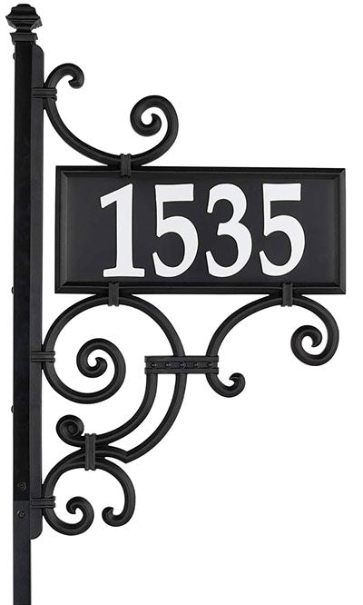 Enhance your curb with your address in moments using this Whitehall Ironwork Reflective Address Sign and Post. The slender body, metal and plastic construction, and classic black finish add a timeless look to this unit, while generous scrolls at the top and base capture attention. A dual sided, rectangular plate extends 13" outward, and each side holds up to five of the included, 4" tall, plastic numerals. This allows you to handily display your house number, and their reflective finish and white hue keep the information visible through the evening. A bevy of spirals and curves above and below this plaque mimic wrought iron, and the included, square post makes installation simple. The ornate plaque easily attaches to the top section of the post, or can be screwed into a fence post, column, or wall for a different effect. Add one base section to the post for a 40.75" tall sign, or use both bottom sections together for added height and visibility. The black hue throughout the unit offers classic style, while the stepped top and hardy construction complete the piece. Bring a timeless look to your yard and house number using this Ironwork Reflective Address Sign and Post. Some assembly required.