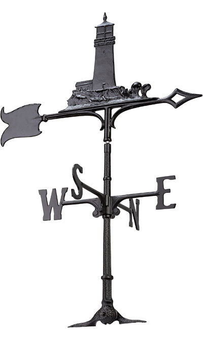 Guide visitor's gazes to the top of your roof by placing this Whitehall Lighthouse Accent Weathervane on it. Placing this aluminum accent atop your garage or barn brings a nautical element to the setting, while the black finish contrasts the blue sky. A familiar lighthouse silhouette creates the focal point, raised lines on it adding striking detail to the piece. Upright wave shapes at the base perfectly mimic water, and this piece sits on the 23.5" long arrow. Solid fletching and an open tip lend dimension to this arrow, which attaches to the included mast and swivels easily in a breeze to form a working instrument. Place the directional indicators properly on the mast, so you can correctly identify the wind direction at a glance. Made from aluminum, this piece provides many seasons of service, and its versatile base makes it simple to attach to a bevy of roof pitches. Place a navigational icon atop your home with this Lighthouse Accent Weathervane. Assembly required.