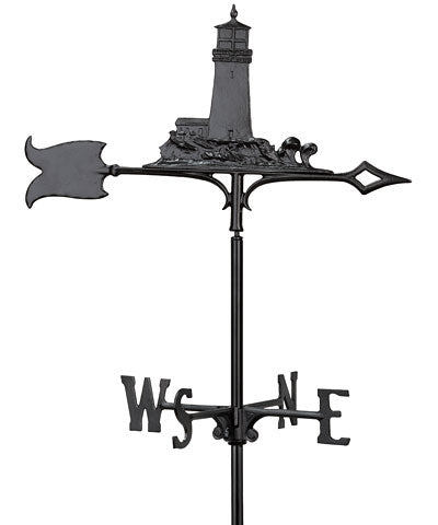 Guide visitor's gazes to your landscaping by placing this Whitehall Lighthouse Garden Weathervane in it. Displaying this aluminum accent within your flowerbed brings a nautical element to the setting, while the black finish contrasts your blooms. A familiar lighthouse silhouette creates the focal point, raised lines on it adding striking detail to the piece. Upright wave shapes at the base perfectly mimic water, and this ornament sits on the 23.5" long arrow. Solid fletching and an open tip lend dimension to this arrow, which attaches to the included mast and swivels easily in a breeze to form a working instrument. Place the directional indicators properly on the 60" tall mast, so you can correctly identify the wind direction at a glance. Made from aluminum, this piece provides many seasons of service, and its base makes it simple to place in soil. Adorn your yard with a navigational icon using this Lighthouse Garden Weathervane. Assembly required.