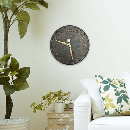 Bring the luxurious serenity of the beach to your patio wall or home using this Whitehall Bronze Verdi Palm Tree Clock. This classic, aluminum clock is well suited for use indoors or outside, and its raised, central palm tree motif enhances its scenic appeal. The detailed image of the tree adorning the clock face provides a charming focal point against a dark and textured background, with verdigris hues below the raised numbers on this analog clock helping them stand out. A pair of bright, golden colored hands completes this unit in distinct style. Raised dots rest between the numbers on this vintage clock, helping mark more detailed units of time, and this piece uses an included, AA battery for power. Attached mounting hardware makes it simple to place this extravagant timepiece against a wall, and its brown, bronze, and green tones lend a nostalgic flair to your personal space. Celebrate idyllic beauty in vintage style with the help of a Bronze Verdi Palm Tree Clock. Made in the USA.