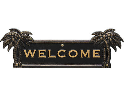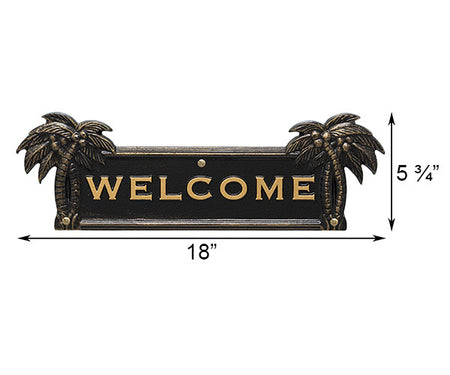 Add a tropical motif to your deck, patio, or home using this Whitehall Black and Gold Palm Tree Welcome Wall Plaque. Four traditional palm tree figures flank this rectangular marker, each slightly curved for style and interest. Gold colored paint on the individual coconut shapes, fronds, and bark bring striking detail to the marker, while the rectangular center reads "Welcome" in all caps. The matching gold tone of the message contrasts the black background for plenty of visibility, and the aluminum construction remains durable for many seasons. Use the included hardware to place this sign against an indoor or outdoor wall easily, as it is hardy enough to withstand exposure to the elements. Invite visitors into your tropical retreat using this Black and Gold Palm Tree Welcome Wall Plaque. Made in the USA.