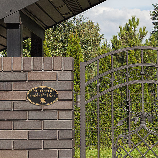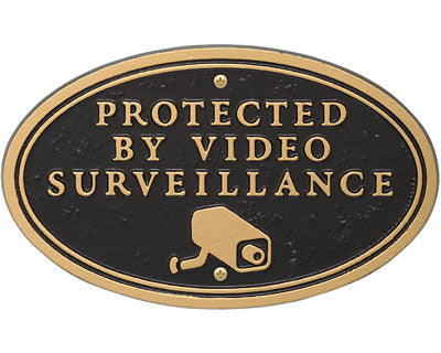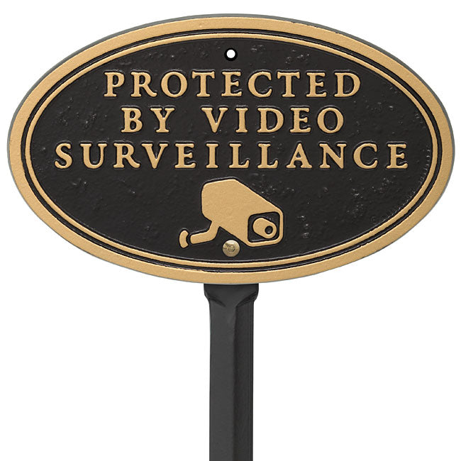Clearly indicate that your premises is electronically monitored using this Whitehall Black and Gold Surveillance Camera Statement Plaque. This straightforward, oval aluminum sign is designed for several seasons of use, and its traditional color scheme enhances your property. The phrase "Protected by Video Surveillance" occupies the center of this unit, followed by a rendering of a security camera. This statement is cast into the plaque, adding dimension to the item, and the gold paint on these raised sections contrasts the black background for plenty of visibility. Two predrilled holes and included hardware make it simple to place this sign against a wall. For a different look, attach the included, metal stake to the piece and insert it into soil. Discourage crime and help keep your property safe using this Black and Gold Surveillance Camera Statement Plaque. Made in the USA.