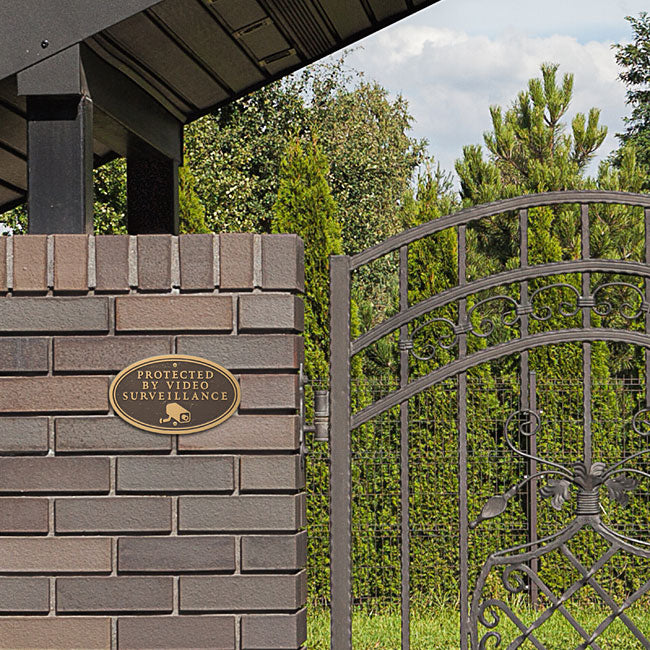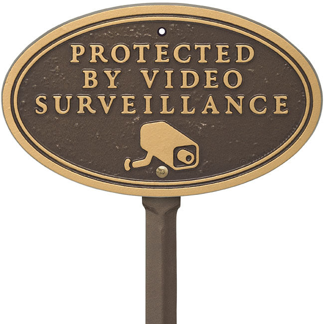 Clearly indicate that your premises is electronically monitored using this Whitehall Bronze and Gold Surveillance Camera Statement Plaque. This straightforward, oval aluminum sign is designed for several seasons of use, and its traditional color scheme enhances your property. The phrase "Protected by Video Surveillance" occupies the center of this unit, followed by a rendering of a security camera. This statement is cast into the plaque, adding dimension to the item, and the gold paint on these raised sections contrasts the aged bronze background for plenty of visibility. Two predrilled holes and included hardware make it simple to place this sign against a wall. For a different look, attach the included, metal stake to the piece and insert it into soil. Discourage crime and help keep your property safe using this Bronze and Gold Surveillance Camera Statement Plaque. Made in the USA.