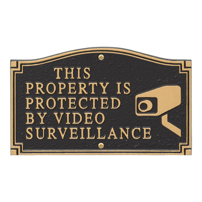 Make it clear that outside visitors are monitored by displaying this Whitehall Black and Gold This Property Is Protected By Video Surveillance Plaque with Graphic. This prominent black marker with gently raised gold letters and detailing sends a straightforward warning to any observer who thinks to trespass on your private grounds. A helpful depiction of a watchful surveillance camera occupies one corner of this elegant item, with center text denoting “This Property Is Protected By Video Surveillance” for reinforcement of the message. Each of the plaque’s four corners is embellished by a decorative, golden square for charming ornamentation, and this staunch showcase piece comes equipped with a variety of display options. Included hardware makes it easy to affix the handy unit to your fence or shed, and an included, 18” lawn stake gives you the option to place the plaque directly into the soil for prominent viewing. The durable, aluminum piece is rust and weather resistant, offering resilient and long lasting appeal as it graces your outdoor space for years to come. Fend off uninvited foot traffic by sending a simple reminder with this Black and Gold This Property Is Protected By Video Surveillance Plaque with Graphic. Hand cast from recycled aluminum in the USA. Five year warranty.