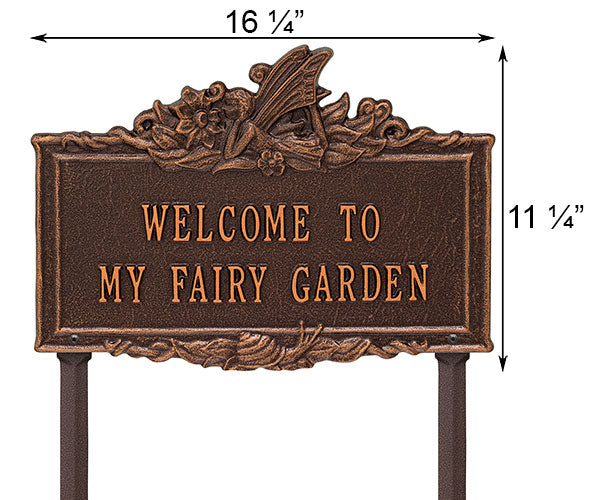 Lend beguiling style and an inviting hint to your secret garden using this Whitehall Antique Copper Welcome to My Fairy Garden Lawn Marker. A defined fairy figure reclines along the top of this plaque, surrounded by flowers, leaves, and tendrils to further the sylvan motif. A snail and additional vine shapes adorn the base of the rectangular sign, and a textured interior reads "Welcome to My Fairy Garden" in all caps. The lighter copper tone of this phrase contrasts the darker background for fantastic visibility, and the aluminum construction remains durable. Attach the two included, 18" long lawn stakes to the base of the marker for placement in your garden soil. Transform your landscaping into an enchanted retreat using this Antique Copper Welcome to My Fairy Garden Lawn Marker. Made in the USA.