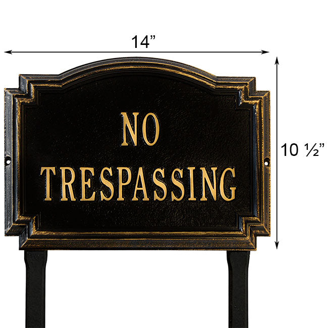 Request that pedestrians avoid your property by placing this Whitehall Black and Gold Williamsburg No Trespassing Lawn Marker in your front yard. An arched top, inverted corners, and textured background lend remarkable detail to this hardy sign, while the gold colored characters remain easily visible against the black base. The unit reads "No Trespassing" in all caps, wonderfully centered and visible from quite a distance away. Attach the two included, 20" long stakes to the back of this item, for installing and displaying in your yard easily. Use screws to place it against a wall for added versatility. Durable aluminum forms this plaque, remaining hardy without rusting for several seasons, and gold colored hints on the defined border match the lettering for a unified effect. Discourage visitors from coming onto your property with this Black and Gold Williamsburg No Trespassing Lawn Marker. Made in the USA.