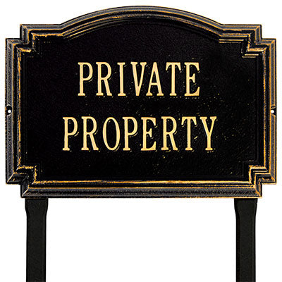Silently and definitively direct visitors off of your land with this Whitehall Black and Gold Williamsburg Private Property Lawn Marker. Placing this unit at the front of your lawn clearly indicates your property line, and discourages others from walking on it. The black, cast aluminum body remains durable while being exposed to the elements, and the gold tone of the raised text ensures visibility. The item reads "Private Property" in all caps, centered on two lines to wonderfully fill the piece. A raised border with arched top and inverted corners completes the aluminum sign, while 2 included stakes aid in placement. These 20" long legs attach to the plaque and install into soil easily, or the unit may be wall mounted with screws for added versatility. The black and gold tones offer a classic look, and the cast aluminum construction provides hardiness. Mark your property line with ease using this Black and Gold Williamsburg Private Property Lawn Marker. Made in the USA.