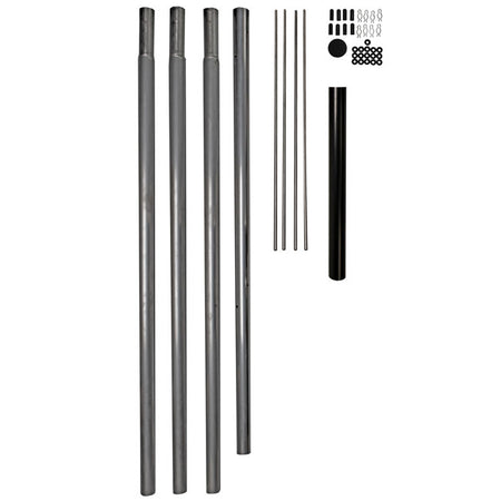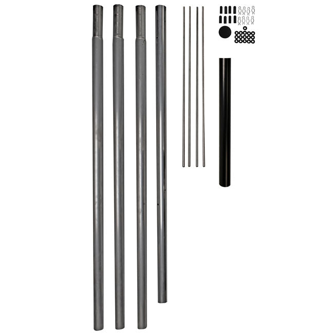 Package Contents: 4 pole sections, 4 hanging rods, 1 ground socket, and hardware
