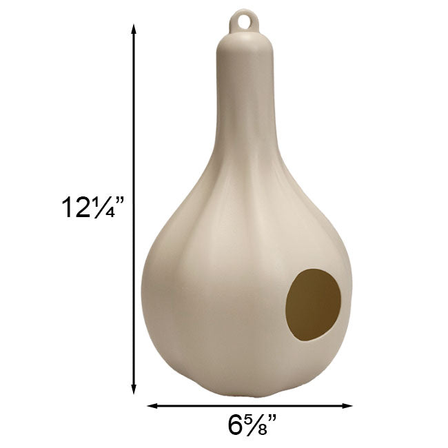 Bring a nature-inspired, time tested shelter to your bird garden with this Wild Bird Lover's Single Purple Martin Gourd. Dried, hollowed gourds were successfully used in centuries past as housing for migratory purple martins, and the extended neck and rounded body of this roost perfectly evokes this shape. Alternating raised and impressed elements at the flared end of the neck lend fantastic texture and a natural appeal to this piece, while a 2.125" diameter entry hole provides safe passage for martins. This leads to a 6.25" diameter, interior nesting area, deep enough for birds to place eggs near the back, away from predators. A drainage hole on the slightly flattened base helps the home and compartment remain dry, while the beige tone keeps fledglings cool in the summer. Readily suspend this gourd using its integrated top loop; it can either be placed below an existing house, or situated on a gourd rack system for a different look. Its molded, plastic body is simple to maintain and clean for use again and again, while offering lasting shelter to your feathered friends. Increase the nesting options for your martin colony with this Single Purple Martin Gourd.