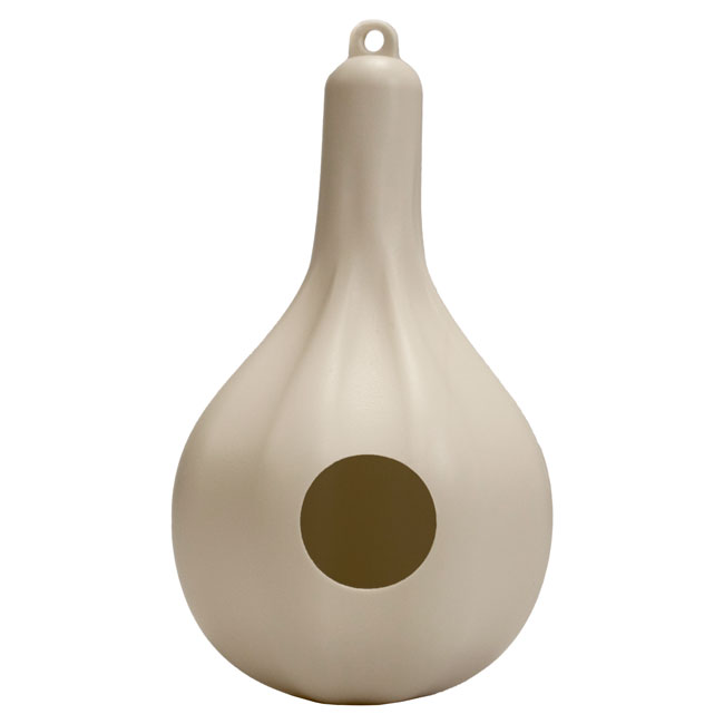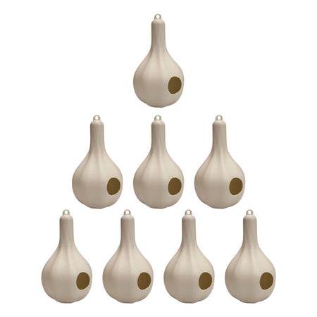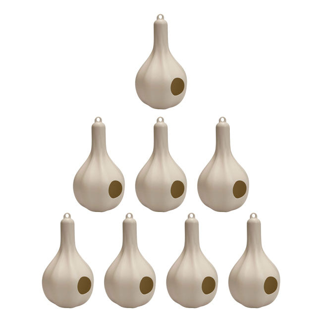 Invite a cornucopia of entertaining purple martins to your bird garden with this abundant pack of 8 Wild Bird Lover's Single Purple Martin Gourds. In centuries past, dried, hollowed gourds were often used as housing for migratory purple martins, and the extended neck and rounded body of each roost wonderfully evokes this shape. This full set of handy gourds is the ideal solution for creating a vibrant martin locale in your bird garden. The units sport alternating raised and impressed sections throughout their bodies for fantastic texture and allure, and a 2.125" diameter entry hole provides safe passage for lovely martins. This leads to a 6.25" diameter, interior nesting area in each gourd where birds can safely deposit their precious eggs away from predators. A drainage hole on each slightly flattened base encourages a dry and unspoiled compartment, and the beige coloration keeps the colony at a cool temperature throughout the summer months. Suspend these gourds using their integrated top loop, place them either below an existing house or on a gourd rack system (not included) for multiple showcase options to meet your personal décor needs. These durable, plastic gourds lend you a reliable, easy to maintain option that will help give martins safe dwelling while beautifying your outdoor space throughout extended use. Create a sizable locale for purple martins in need of shelter with this time-tested and handy pack of 8 Single Purple Martin Gourds.