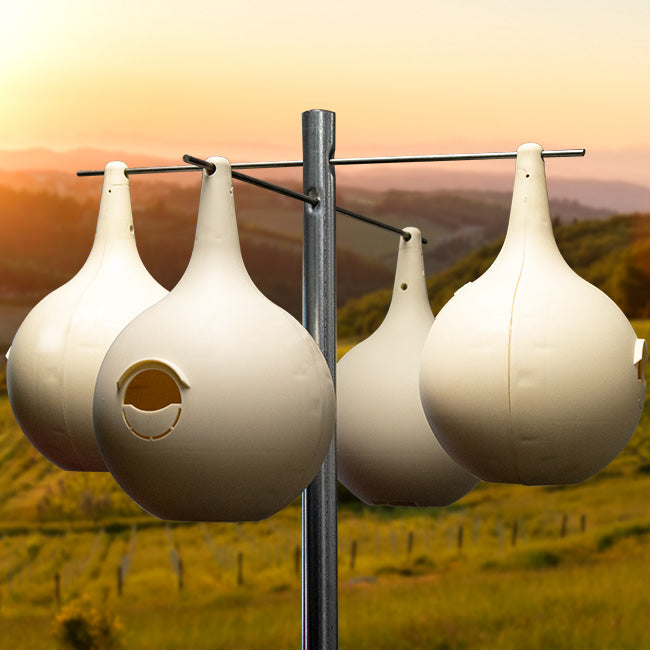 Offer fantastic and comfortable housing for wonderful purple martins in your bird garden with these Wild Bird Lover's Two-Piece Martin Gourds. This handy pack of 4 gourds lends delightful martins a safe and reliable set of roosts, while adding variety and interest to your yard. Each gourd features a front and back section which interlock for sturdy assembly, while an included screw toward the slender, top neck keeps each nest securely joined. The rounded base of each gourd forms an expansive, 7" diameter nesting area, and the crescent-shaped entry helps discourage larger birds from invading the dwelling. If starlings are not a concern, use the perforations to remove the extra material at the base of the entry, transforming it into a 2.125" diameter, round opening as an alternative. A small, plastic canopy situated above the entrance protects the nest from rain and inclement weather, while a pair of slots on each gourd’s base lends superior drainage for accumulated water. Each gourd’s off white tone keeps the nesting area temperature well-regulated, helping the birds stay cool during hot summer days, while reminding of natural gourds used throughout the past. A hole situated at the top of each unit lets you conveniently and easily display these wonderful items beneath your existing martin house (not included) or on a rack (not included) for a functional and appealing showcase. Durable, plastic bodies mean these pieces will hold up reliably over many seasons of service, while maintenance and cleaning is a simple task thanks to the two-piece design. Give martins plentiful and helpful housing options with this pack of 4 Two-Piece Martin Gourds. Assembly required.