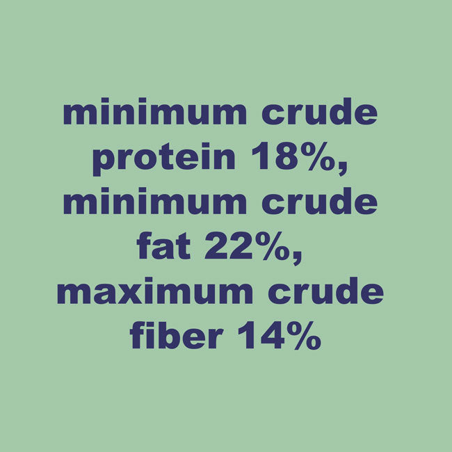 Guaranteed Analysis: minimum crude protein 18%, minimum crude fat 22%, maximum crude fiber 14%