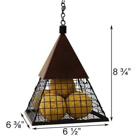 Combine geometric accents with the natural shapes of your garden using this Wildlife Sciences Pyramid Suet Ball Feeder. Durable, powder coated metal forms this innovative feeder, and its brown and black tones further the classic effect. The center chamber easily holds up to five 2" diameter or smaller suet balls, and the intersecting metal rods create a grid for birds to cling and dine. Solid metal sheets cover the top of this bold reservoir, and their brown tone wonderfully contrasts the black base and threaded top. Unscrew this top knob and remove the cover to expose the 2.375" diameter opening on one side of the unit. This allows you to easily fill it with suet balls, and a chain extending from the knob makes placement on a hook or bracket simple. The powder coating protects this metal feeder from the elements, and the thin rods are perfect for clinging birds to grip and dine. Provide suet in a fun new way to select songbirds with this Pyramid Suet Ball Feeder.