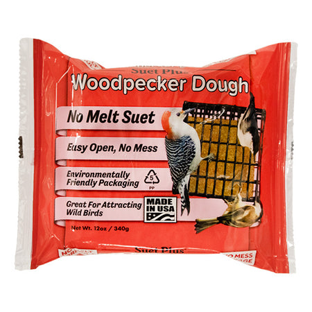 Provide a high energy treat to local woodpeckers and other wild birds with this Wildlife Sciences Suet Plus Woodpecker Dough. This suet is made from an excellent blend of nuts within the rendered beef fat, appealing to hungry woodpeckers and providing them a high-energy treat to help them flourish in all seasons. The easy to open, no mess wrapper uses 80% less packaging than suet in a tray, allowing you to handle this nutritious snack with ease as you place it in your standard suet feeder for a generous offering in your bird sanctuary. With considerate packaging, less energy is consumed on freight and manufacturing, establishing this fulfilling feeding choice as an eco-friendly option. Simply place one of the dense and wholesome cakes in your suet cage or on a platform feeder to invite local woodpeckers and others to come dine in hardy luxury. Lend a healthy and nourishing diet to hungry woodpeckers and wild birds with the Suet Plus Woodpecker Dough. Made in the USA.