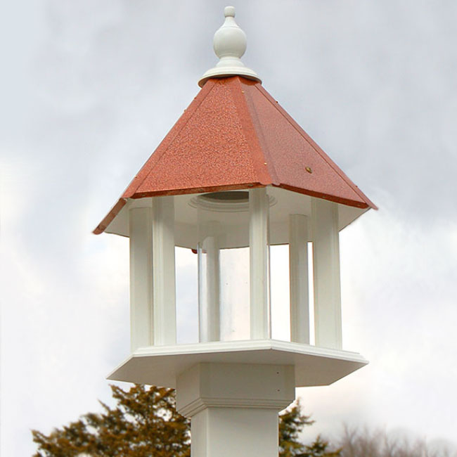 This impressive feeder has six white columns surrounding the seed tube, and upholding the six-paneled roof. The piece is made from solid PVC trimboard, which will not mold, mildew, or delaminate, and will stay stable for 25 years. A copper colored finish atop the PVC roof perfectly contrasts the white finial. This top accent can easily be removed for quick cleaning and refilling of the seed tube. Mount this feeder on a true 4" x 4" post (not included) to complete your bird garden. Celebrate bird feeding with the Azalea Bird Feeder with Hammered Copper Colored Roof. Handmade in the USA.
