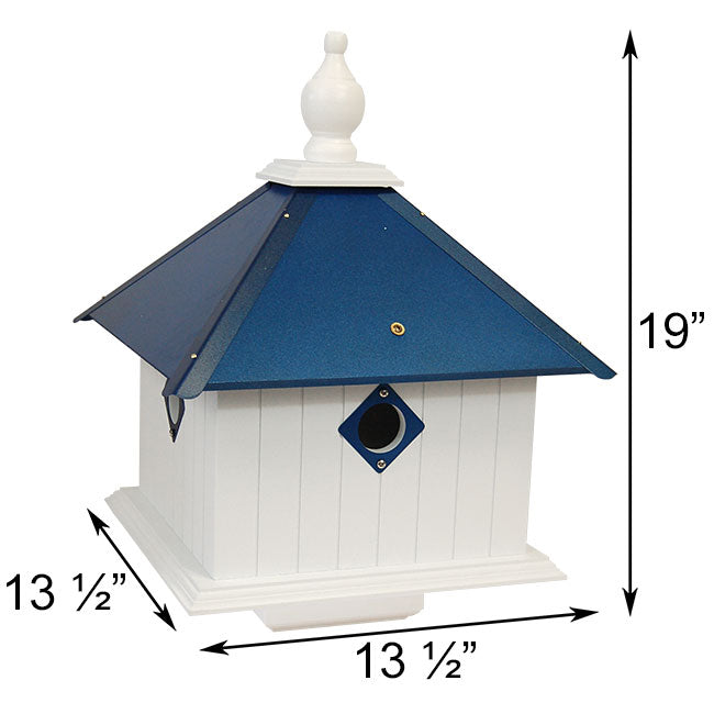 Establish a haven for your feathered friends with help from this Wing and A Prayer Carriage Bird House with Cobalt Blue Roof. Traditional styling and modern elements combine on this home for a fantastic look, while the vivid, blue roof captures attention. The square body is divided into four separate apartments, each with a 1.5" diameter entry hole. A pyramidal, cobalt blue roof covers these compartments, and a matching metal predator guard surrounds each entry for added visibility. Routed, vertical lines on the exterior, PVC body create a slatted wood effect, and a bottom ledge offers a finished look. This durable material withstands seasons of use without molding or rotting, and the white color of the body remains vivid. The deep blue, PVC roof and matching, metal tines keep the shelter dry, and a white, wooden finial on the top adds height. Place the preinstalled base collar on a true, 4" x 4" post (not included), for a remarkable display in your garden. House a few of your favorite songbirds and bring bold tones to your yard with this Carriage Bird House with Cobalt Blue Roof. Made in the USA.