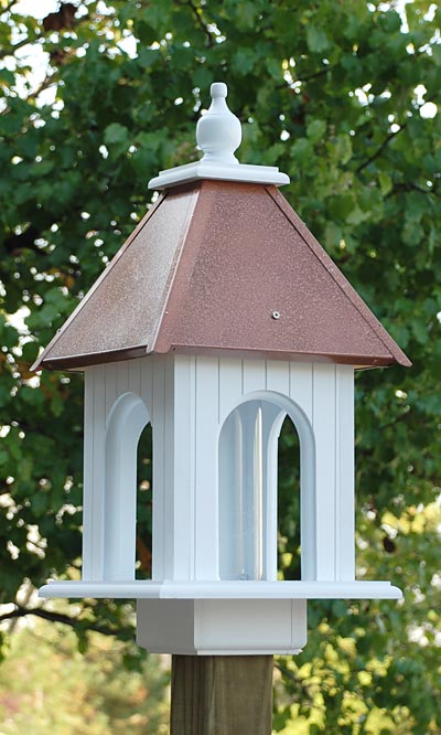 Create an impressive feeding station in a field or open space with this Wing and A Prayer Dogwood Bird Feeder with Hammered Copper Colored Roof. This significant feeder combines architecture and function for a stylish accent in any setting. An arch on each side of the square platform creates a passageway for birds to enter the feeding area, while recessed lines add a paneled effect for more detail. A generous, 2.8 quart capacity seed tube rests in the center of the item, holding mixed or other type seed. Six arches on the bottom of the seed tube allow feed to exit the reservoir and rest on the platform, assisted by an integrated seed diverter block. Place suet, fruit, or mealworms on the tray to entice a wider variety of birds to visit. The steep roof and decorative finial prevent water from entering the reservoir and ruining the feed, and the clear plastic tube allows seed levels to remain visible at all times. The feeder is constructed from solid PVC trimboard, which will not mold, mildew, or delaminate for years of use. The copper colored PVC on the roof contrasts the vivid white of the feeder itself, bringing a classic look to the item, and a preinstalled mounting collar easily accepts a true 4" x 4" post (not included). Bring a timeless appeal to your bird garden with this Dogwood Bird Feeder with Hammered Copper Colored Roof. Made in the USA.