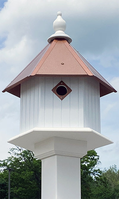 Create housing for several birds at once using the Wing and A Prayer Gardenia House with Hammered Copper Colored Roof. This hexagonal dwelling has three individual apartments, creating room for a few birds at once. Each apartment has its own 1.5" diameter entrance hole, with a metal predator guard which matches the copper colored, PVC roof to prevent the holes from being enlarged. A small ledge around the base of the house offers perching for fledglings, and recessed lines on the side panels add an architectural feel. Offset sides prevent territory disputes between birds, giving each avian family their own entrance and ledge. The copper color and hammered finish on the PVC roof bring a surprising bit of detail to the piece, and a large white finial tops the unit. The home is crafted from solid PVC trimboard, which will not mildew, mold, or delaminate, for a stable home for up to 25 years. The roof may be removed for nest checks and cleaning, and the interior walls lift out easily. Use the preinstalled mounting collar to attach this home to a true 4" x 4" post (not included) for height and stability. Place the Gardenia House with Hammered Copper Colored Roof in your yard for a dramatic and functional roost for years to come. Made in the USA.