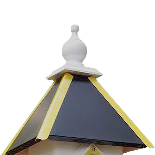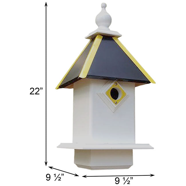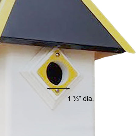 Showcase your favorite team in your backyard using the Wing and a Prayer Team Colors Bird House with Black Roof and Gold Accents. This fantastic, durable shelter provides small songbirds a wonderful roosting spot, and its all white body lends a classic hint to the piece. The black, painted PVC roof captures attention, while its gold colored, metal tines and predator guard clearly display your support of your favorite hockey or football team. Crafted from durable, square PVC tubing, this home offers plenty of room for a woodpecker, bluebird, or chickadee family, and the modern construction will retain its integrity year after year without delaminating, rotting, or mildewing. A 1.5" diameter entry hole rests on the front of this house, and PVC trimboard surrounds it for depth. This trim acts as a predator guard, preventing raccoons from reaching into the nest, and a gold piece of metal atop the guard keeps squirrels and woodpeckers from enlarging the hole. The roost remains protected with the generous, black roof, and the gold colored tines enhance the theme. A white, wooden finial tops the shelter, and this can be removed for quick nest checks. It also allows the roost to remain ventilated for nestling safety. Blocks keep the floor in place at the base of the home, and elevate the nest from the floor to protect it from captured water and parasites. An extended platform around the base of the structure creates places for songbirds to land, and the attached collar allows you to display the shelter on a true 4" x 4" post (not included). Blend your bird watching and sport watching hobbies with this Team Colors Bird House with Black Roof and Gold Accents. Made in the USA.