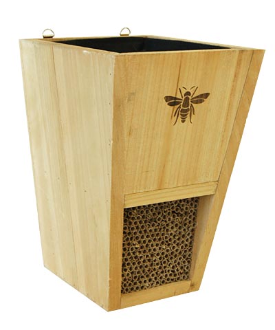 Create a haven for solitary, pollinating bees in your yard with this Woodlink Combination Mason Bee House and Planter. This generous piece not only helps you showcase a beautiful plant; it also provides shelter to solitary bees. The wooden frame perfectly celebrates the outdoors, and the lined, top reservoir holds a wealth of soil. An opening in the fabric liner aligns with a channel on the back of the planter, allowing water to drain from your flower without reaching the bee tubes. These fiberboard tubes are fantastic roosting spots for orchard and mason bees, and an open face on one side of the frame allows the bees to reach them. A stylized bee image in the planter adorns the panel above the nesting tubes, and the angled design of this section helps direct rainwater away from the insects. Two hangers on the back of the item make it easy to mount against a tree or wall, or the level base may be placed on soil and displayed in your garden. The wooden construction aids in attracting bees to the unit, and the fiberboard tubes are perfectly sized for small insects. Help your garden thrive by adding this Combination Mason Bee House and Planter to it.