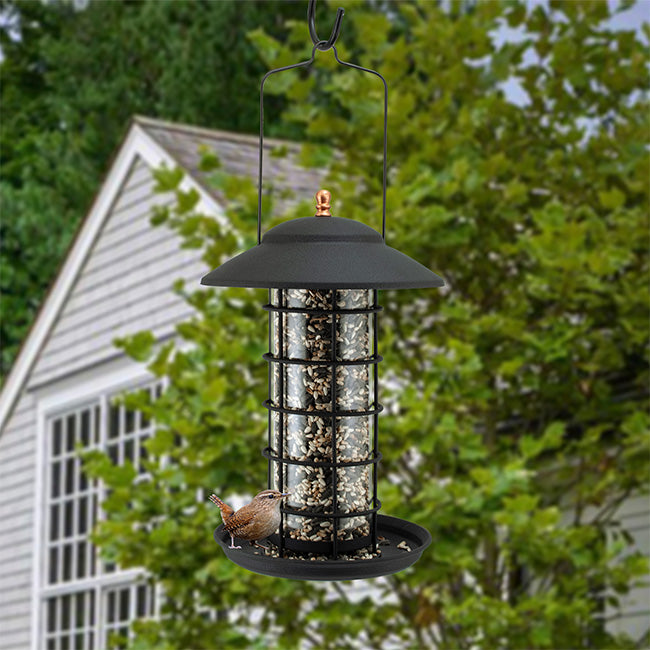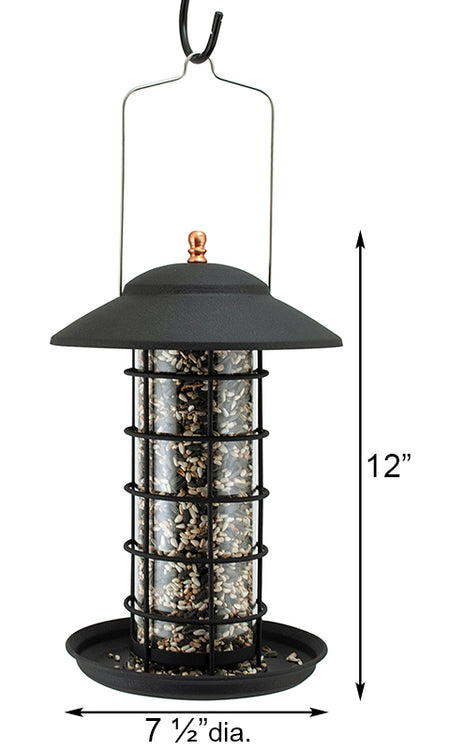 Nourish the birds of your garden with this Woodlink Matte Black Metal and Glass Lantern Bird Feeder. The classic design of this feeder mimics a farmhouse lantern, bringing unique style to your patio or bird garden. A center glass reservoir holds 1 quart of seed, which fills the tray through a 0.75" gap underneath. Small holes around the tray offer drainage for keeping the seed dry, and a 1" raised lip encircling it enables perching and dining for small birds. A cage of rectangles made up of hardy, metal wire surrounds the reservoir, creating a lantern-like facade, while a single-stepped metal cap covers the top with plenty of overhang to provide cover for the seed tray below. A copper-colored metal knob sits atop the center of this lid, and a metal wire hanger extends out from the lid for easy placement on a branch or hook. The glass and metal construction creates a durable store for seed while accenting any garden space. Guide the local birds to your bird garden using this Matte Black Metal & Glass Lantern Bird Feeder.