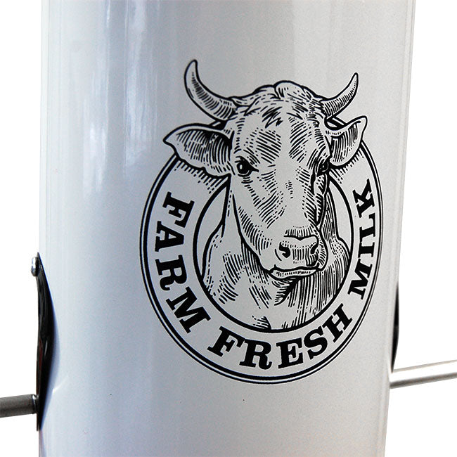 Continue the timeless tradition of bird feeding by adding this Woodlink White Milkhouse Vintage Milk Can Bird Seed Feeder to your garden. The familiar shape and classic colors on this feeder perfectly mimic an antique milk can, bringing a vintage hint to your yard in moments. The lengthy body, crafted from hardy steel, holds 2.4 quarts of bird seed, and four ports on the piece enable a few birds to dine simultaneously. Extended, metal perches on each port provide your feathered friends a resting spot, and each opening has a black, metal frame around it for strength and definition. A circular logo reading "Farm Fresh Milk" and detailed line drawing of a cow adorn one side of the feeder, their black tone contrasting the painted white body. A tapered neck, flat lid, and two handles complete the nostalgic shape, while providing necessary function. The lid fully covers the reservoir, protecting seed from the elements, and the hanging cable attaches through the handles for placing the item on a bracket. Crafted from steel, this feeder will remain durable for many seasons, and its white finish helps protect it from the elements. Bring a rustic hint to your bird garden using this White Milkhouse Vintage Milk Can Bird Seed Feeder.